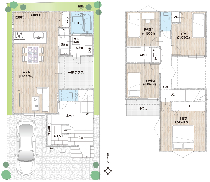 Aプランの第一の特徴は、広々としたリビング直結の中庭テラスです。